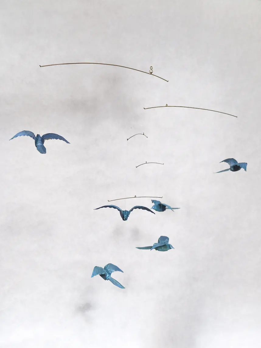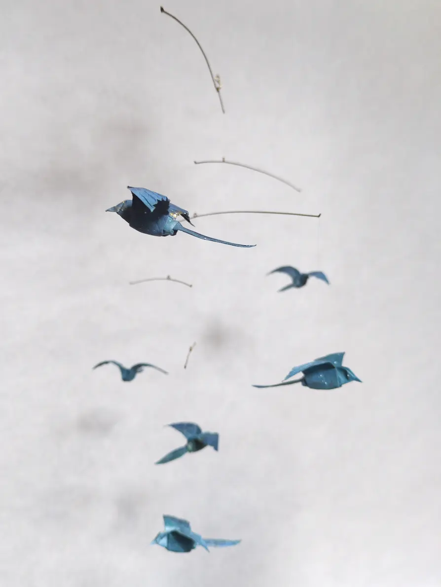 A beautiful hanging mobile with 6 blue origami birds.