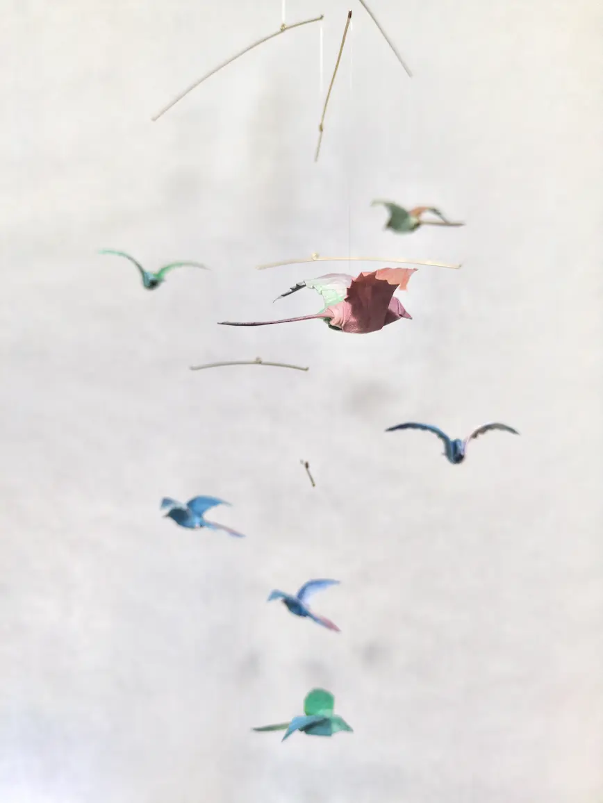 A unique and beautiful hanging mobile with 7 origami birds in different colors.